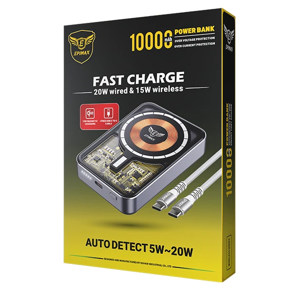 تنها درگاه طراحی شده برای پاوربانک اپی مکس مدل EP-212 از نوع USB-C بوده که هم به صورت ورودی (شارژ خود پاوربانک) و هم خروجی (برای شارژ انواع دستگاه ها) کاربرد دارد. این درگاه با پشتیبانی از فناوری شارژ سریع PD و حداکثر توان خروجی 20 وات، این امکان را برای شما فراهم می کند تا انواع دستگاه های خود را با سرعت بالایی شارژ کنید. درون بسته بندی این محصول، کابلی مقاوم از نوع دو سر Type-C با روکش بافته شده، نیاز شما را در خصوص کابل شارژ برآورده می سازد. مورد جذاب دیگری که می توانید با کمک این پاوربانک دستگاه های خود را شارژ کنید، شارژ وایرلس (Wireless) می باشد. حداکثر توان خروجی برای شارژ وایرلس ، 15 وات بوده که با سرعت مناسبی دستگاه ها را شارژ می کند. البته شارژ وایرلس، فقط برای گوشی های پشتیبانی کننده از این فناوری قابل اجرا می باشد. تراشه هوشمند موجود در این گجت وظیفه دارد تا جریان و توان مورد نیاز با دستگاه متصل شده را شناسایی کرده و سپس با ایمنی بالا اقدام به شارژ کند.