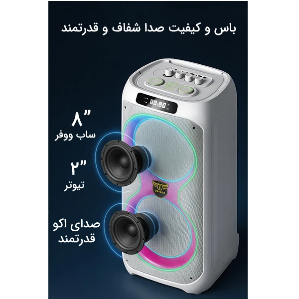 مجهز به دو عدد ووفر 8 اینچی با توان خروجی واقعی 100 وات و حساسیت سیگنال به نویز 80 دسی بل